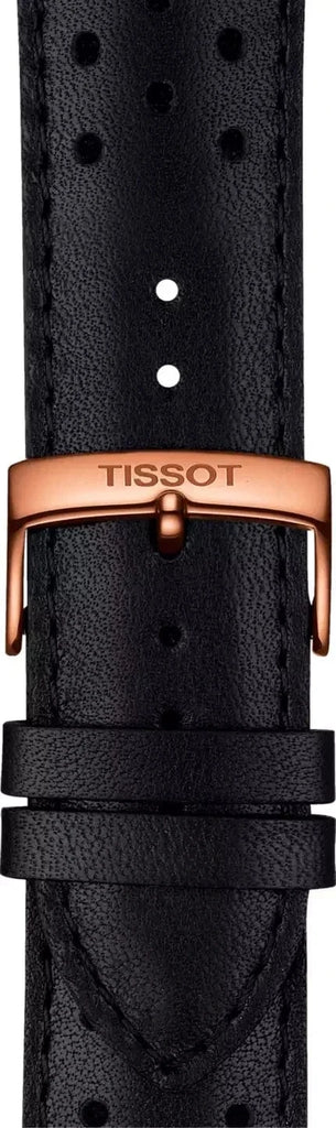 Rose gold PVD stainless steel case with a black microperforated leather strap. Fixed rose gold PVD bezel with a black aluminium top ring showing tachymeter markings. Silver dial with luminous rose gold-tone hands and index hour markers. Minute markers around the outer rim. Dial Type: Analog. Luminescent hands and markers. Date display at the 6 o'clock position. Chronograph - three sub-dials displaying: 60 second, 30 minute and 1/10th of a second. Quartz movement. Scratch resistant sapphire crystal. Screw down crown. Solid case back. Case size: 42.5 mm. Case thickness: 11.22 mm. Round case shape. Band width: 22 mm. Tang clasp. Water resistant at 100 meters / 330 feet. Functions: chronograph, tachymeter, date, hour, minute, second. Sport watch style. Watch label: Swiss Made. Tissot V8 Chronograph Silver Dial Men's Watch T106.417.36.031.00.
