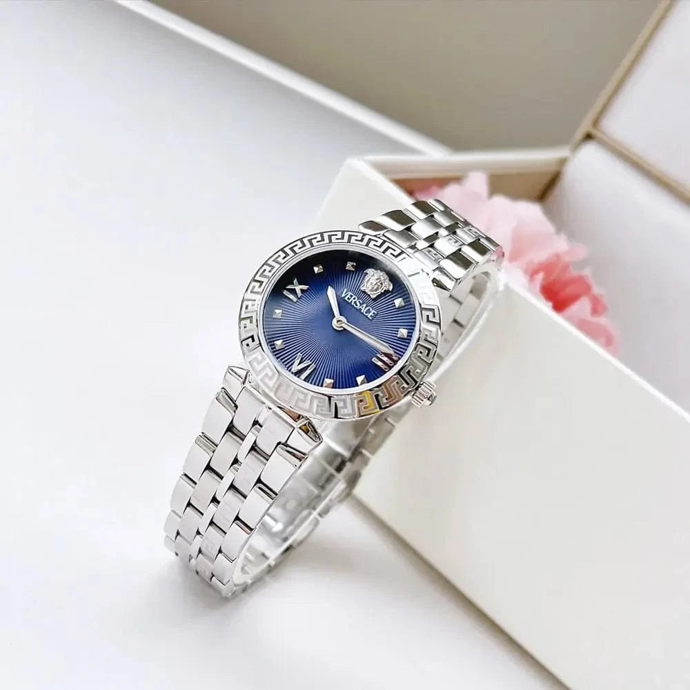 Elevate your style with the Versace Daphnis watch, featuring a striking blue analog dial paired with a sleek silver steel strap. This elegant timepiece blends timeless design with modern sophistication, perfect for women who appreciate luxury and precision. Crafted for durability and everyday wear, it adds a refined touch to any outfit while keeping you punctual in style.