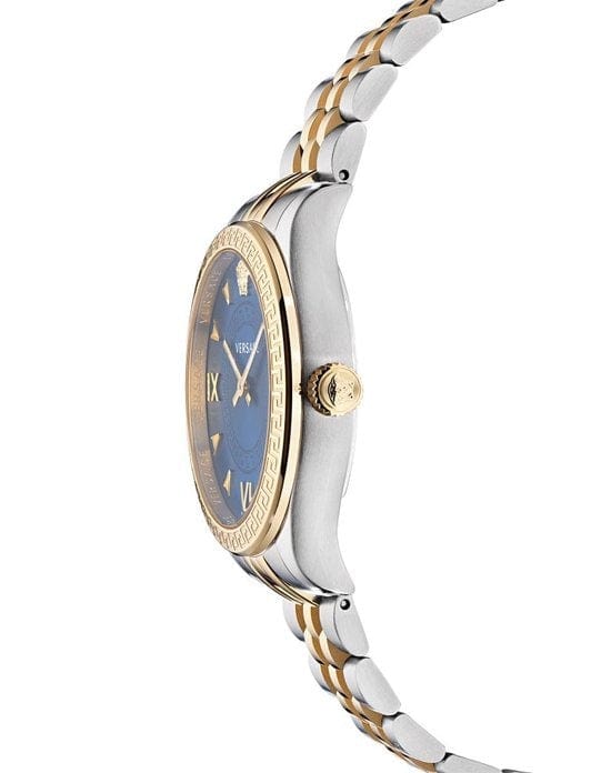 Blue dial enhanced by gold-tone hands. Silver-tone stainless steel case with a two-tone (silver-tone and gold-tone) stainless steel band. Quartz movement. 50 meters / 165 feet water resistance. Fixed bezel. Scratch Resistant Sapphire crystal. Solid caseback. Deployment with Push Button Release clasp. Pull / Push crown. Case size 35 mm. Versace VE2S00522 Hellenyium Watch.