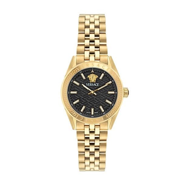 Elevate your style with the Versace V-Code Quartz watch, designed for women who appreciate luxury and precision. Featuring a striking black dial paired with a gold steel strap, this timepiece seamlessly blends elegance and durability. Its quartz movement ensures accurate timekeeping, while the refined design adds a bold, sophisticated touch to any outfit. Perfect for day-to-night wear, the V-Code watch makes a statement of timeless glamour and confidence.